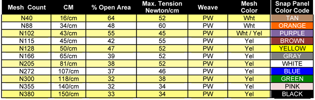 Newman Roller Mesh Snap Panels are color coded for each mesh count.